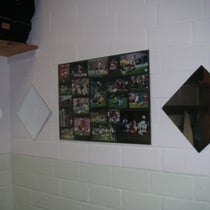 LP-Hüllen-große Spiegel an der Wand (da hat sich der Raumgestalter aber ganz frech was ausgedacht und hat die Selbstzeiger die vorherrschenden Senk- und Waagerechten brechen lassen). Zum