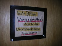 Zumindest den Hauch eines Lächelns zaubert die anscheinend von Grund- schullehrerinnenhand (vermutlich Werken und Reli) gemalte Ermahnung auf sein Hab und Gut zu achten. Inhalt und Form ist