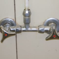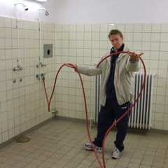 Das wohligwarme Licht der Neonröhren fällt auf manuell gebogene Kupferrohre mit einfachem Duschkopf nach Bielefelder Art. Sie liefern einen streuenden Strahl, wenn nur eine angestellt ist. Beim